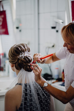 Wir zaubern Ihnen eine wunderschöne Hochzeitsfrisur inkl. passendem Braut-Make-Up in einer ruhigen Atmosphäre, abseits des Trubels, damit Sie sich entspannt auf Ihren großen Tag freuen können. Nach dem Styling lädt unsere Hochzeitslounge Sie ein, sich zurückzuziehen, sich in Ruhe umzuziehen und sich auf den besonderen Moment vorzubereiten. Unser Ziel ist es, dass Sie Ihren schönsten Tag in vollen Zügen genießen können, mit dem Vertrauen, dass Ihr Look perfekt ist und Sie optimal gestylt sind. Wir freuen uns darauf, gemeinsam kreativ mit Ihnen zu sein und Ihren Tag noch unvergesslicher zu machen!